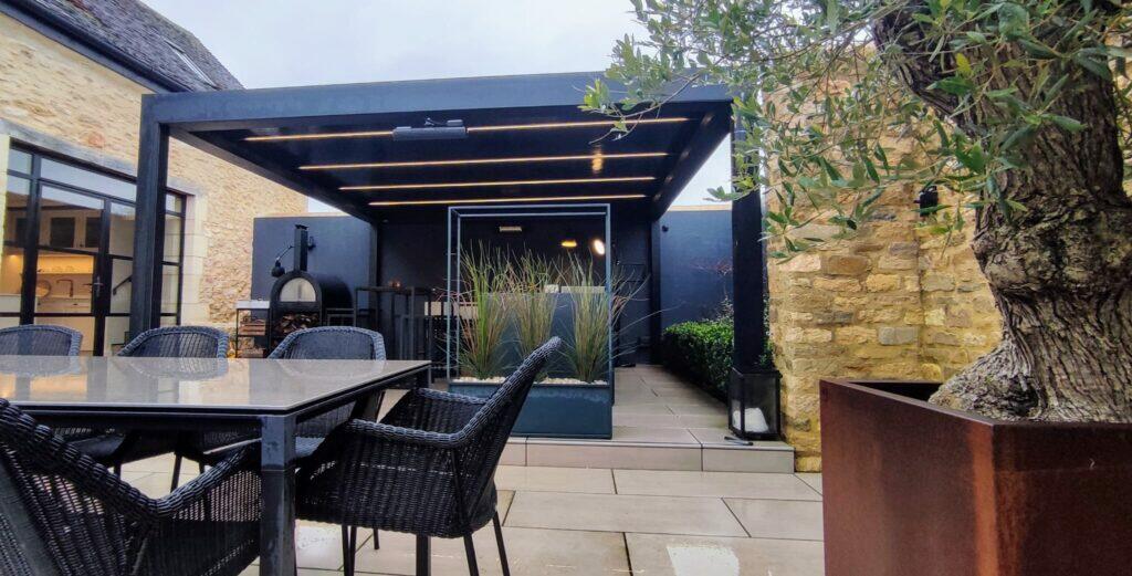 We installed a pergola in a sleek black frame with black louvres to match the property’s existing window frames and colour palette. The retracting roof allows the louvres to stack at one end, creating an open roof space when desired, offering ultimate flexibility for ventilation and natural light.