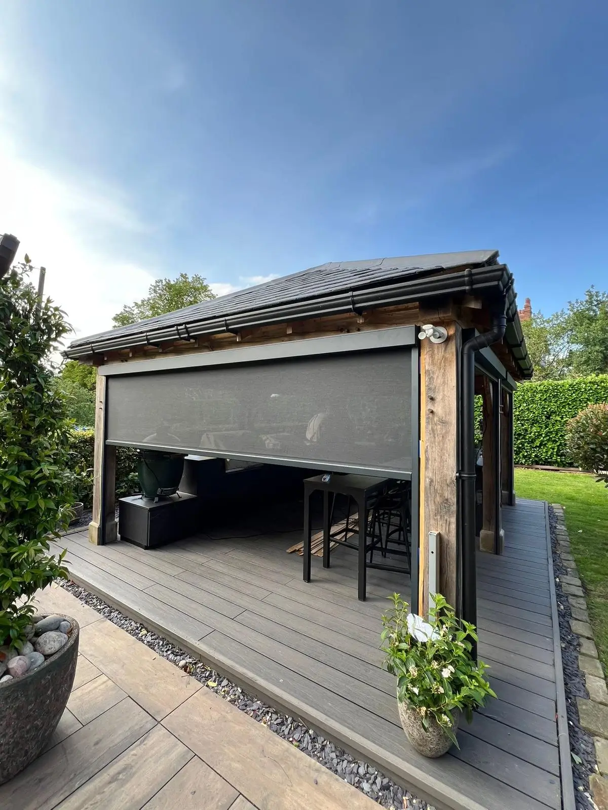 This project in Cheshire involved retrofitting an existing oak-framed building with six retractable screens, dramatically improving its usability as an outdoor kitchen and dining space.