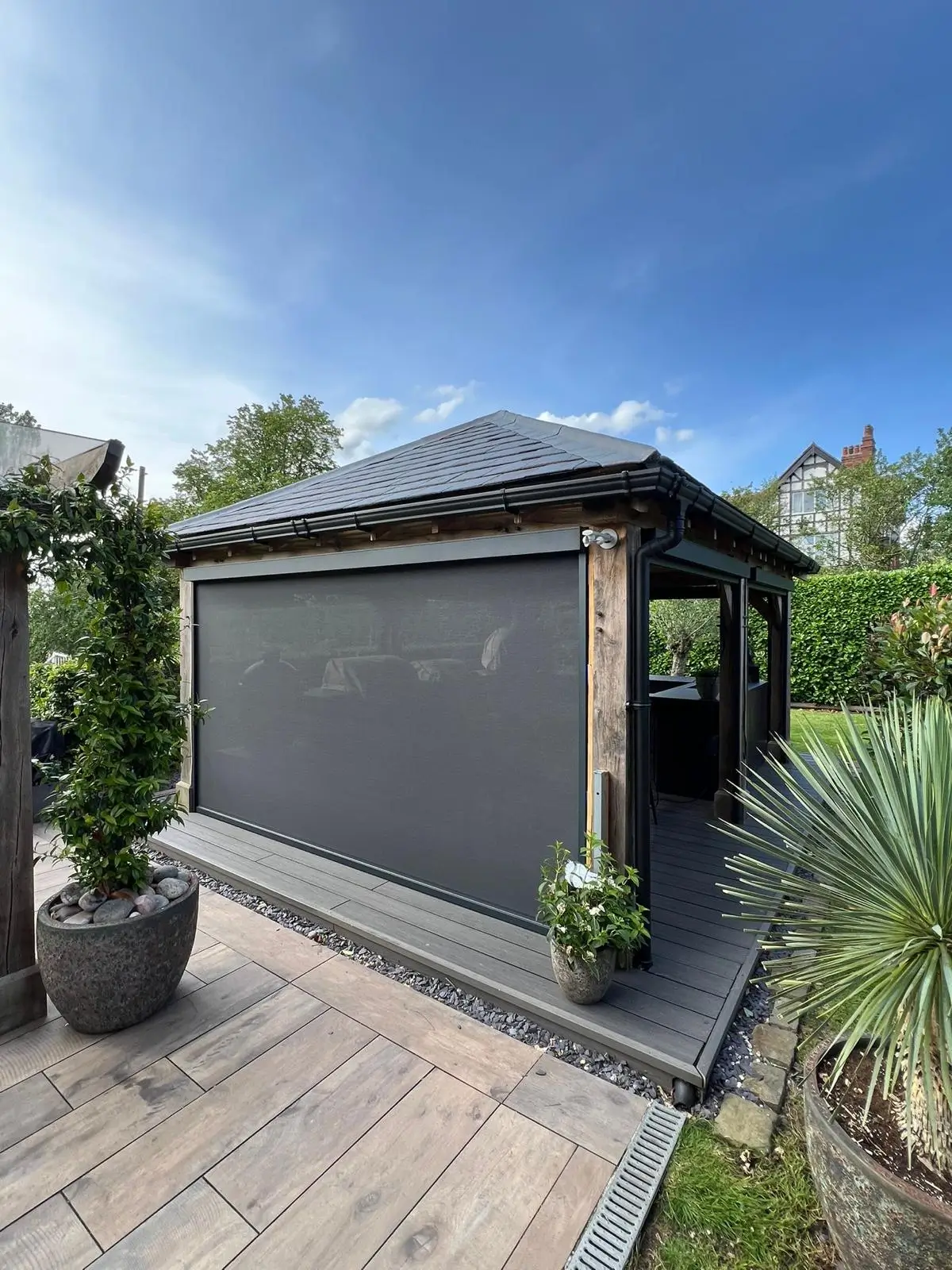 The transformation has been significant — the space can now be used around 80% of the year, compared to occasional fair-weather use before. The retractable screens have created a comfortable, sheltered outdoor kitchen and dining area without compromising the charm of the oak frame design.