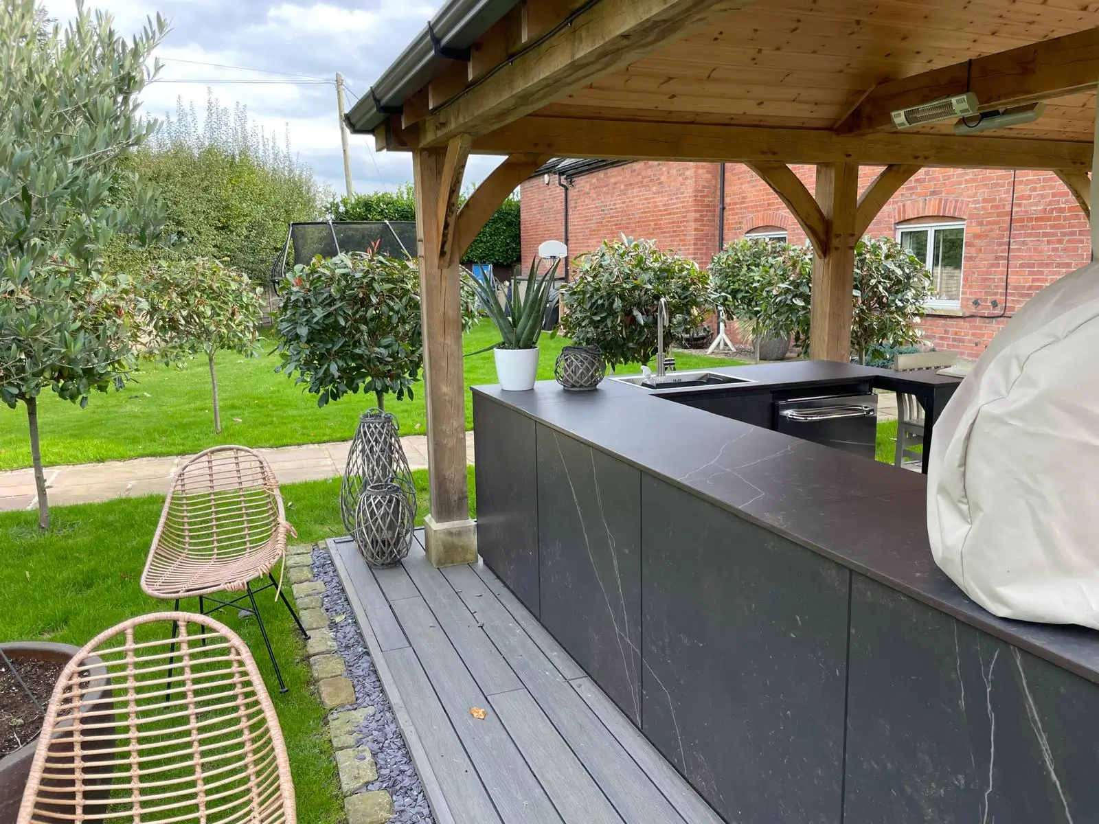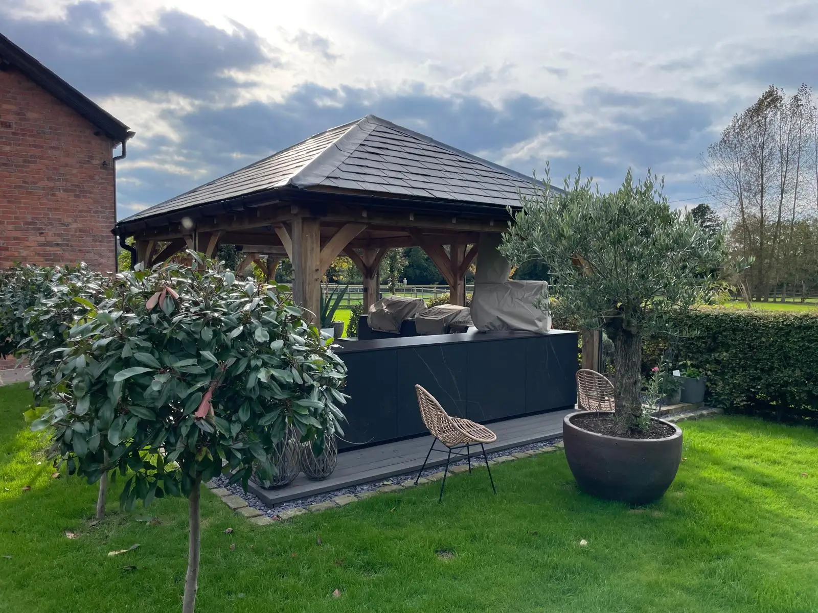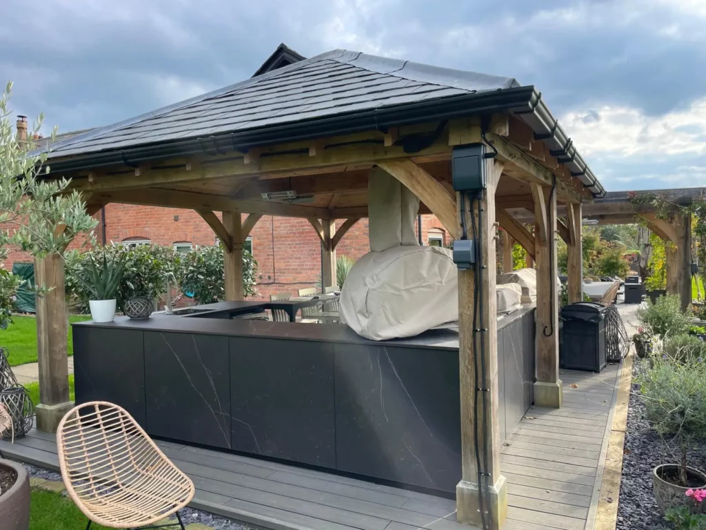 Our client loved their oak-framed outdoor kitchen but found it could only be enjoyed on the very best days due to exposure to wind, rain, and cooler temperatures.